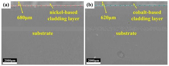 Figure 1 shows the SEM images of the nickel-based and cobalt-based cladding layer cross sections. All the cladding layer cross sections consisted of a cladding layer and a substrate, in which the cladding layer cross sections had no cracks or pores. The average thicknesses of the nickel-based and cobalt-based cladding layers were 680 and 620 μm, respectively.
