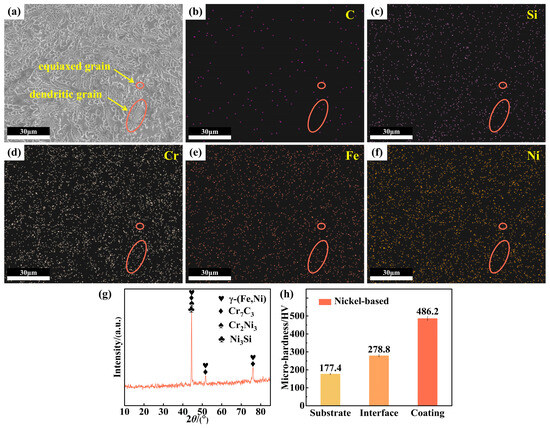 Figure 2a shows that the surface of the cladding layer primarily consisted of equiaxed and dendritic grains. Figure 2b–f revealed that the equiaxed grains were rich in Si, Cr, Fe, and Ni elements. Among them, Si, Cr, and Fe were predominantly distributed at the grain boundaries and Ni was concentrated within the grain cells. The dendritic grains contained high concentrations of Cr, Fe, and Ni. Further analysis with the XRD indicated the presence of multiple phases in the cladding layer, possibly including γ-(Fe, Ni), Cr7C3, Cr2Ni3, and Ni3Si [1,23].
