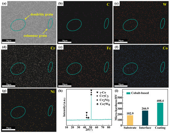 (a) EDX images; (b–g) elemental distribution maps; (h) XRD images; (i) microhardness at feature points on the cobalt-based cladding layer surface.
