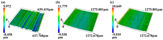 Figure 4 shows the three-dimensional morphology of the wear on the surfaces of the 316L stainless steel substrate and the nickel-based and cobalt-based cladding layers. The substrate surface experienced significant wear, displaying deep and irregular furrows along with a detachment of blocky materials. These signs indicated the presence of abrasive and adhesive wear. By contrast, the cladding layers showed minor signs of wear. The surfaces were relatively smooth, only featuring a small amount of shallow furrows. No significant blocky detachment was observed.