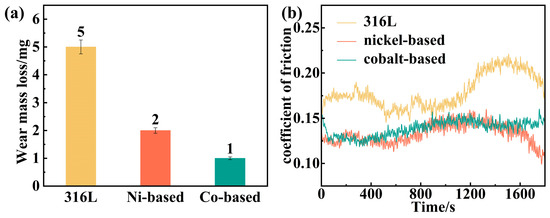 (a) Mass loss; (b) friction coefficient charts of wear after 1800 s of wear on the surfaces of the 316L substrate and the nickel-based and cobalt-based cladding layers.