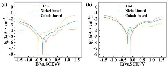 In a 3.5 wt.% NaCl solution environment, Figure 6a shows that both nickel-based and cobalt-based cladding layers have a passive range, showing a better corrosion resistance than the substrate material. To compare the dynamic corrosion performance of the three samples, the Tafel extrapolation method was used to fit the polarization curves to obtain the free corrosion potential (Ecorr) and free corrosion current density (Icorr), as presented in Table 4. Compared with the nickel-based cladding layer, the cobalt-based cladding layer has a higher Ecorr and a lower Icorr, which indicates that the cobalt-based cladding layers have a slower corrosion rate and stronger corrosion resistance [28]. In a 0.5 mol/L H2SO4 solution environment, Figure 6b shows that all three specimens show an obviously different corrosion behavior due to the weak oxidizing property of the testing solution. Considering the wide active–passive range and high current character, the 316L stainless steel substrate shows rather worse corrosion resistance than the nickel-based and cobalt-based cladding layers [29]. As for both cladding layers, the nickel-based exhibits a higher Ecorr and a lower Icorr in Table 4 compared with the cobalt-based, which means that the cobalt-based cladding layer was less susceptible to corrosion than the nickel-based.