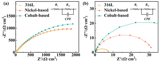 In an equivalent circuit model, CPE represents a constant phase angle difference element instead of an ideal capacitor, Rs represents solution resistance, and Rct represents the charge transfer resistance of the electrode [30]. The test results are presented in Table 5. The Rct value reflects the corrosion resistance of the cladding layers, with lower values indicating more active charge exchange processes and faster corrosion rates. In the 3.5 wt.% NaCl solution environment, the cobalt-based cladding layer had the highest value, followed by the nickel-based and the substrate. Figure 7a shows that all three samples exhibited a single capacitive arc, indicating the presence of a single time constant during the electrochemical corrosion reaction. This stemmed from the homogeneity of the samples and the reaction primarily occurring at the sample-solution interface. Regarding the capacitive arc radius, the cobalt-based cladding layer had the largest, followed by the nickel-based cladding layer and the substrate. The capacitive arc radius reflected the electrochemical impedance of the material surface. A larger radius indicated a higher surface impedance and a better ability to form a passive film, thus a better corrosion resistance [31]. In the 3.5 wt.% NaCl solution environment, Figure 7b shows that all three samples also exhibited a single capacitor arc. Compared with the substrate, the cladding layers showed a larger capacitive arc radius. Table 5 shows that the Rct value of the cladding layers were significantly greater than that of the substrate. Therefore, the experimental results demonstrated that both cladding layers had a superior corrosion resistance compared with the substrate, and the cobalt-based cladding layer slightly outperformed the nickel-based cladding layer. This finding corroborated the results from the Tafel curves.