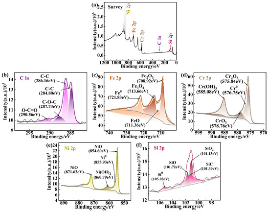 XPS results for the surface of the nickel-based cladding layer: (a) Survey; (b) C 1s; (c) Fe 2p; (d) Cr 2p; (e) Ni 2p; (f) Si 2p.