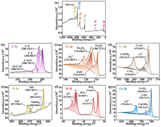 XPS results for the surface of the cobalt-based cladding layer: (a) Survey; (b) C 1s; (c) Fe 2p; (d) Cr 2p; (e) Ni 2p; (f) W 4f; (g) Co 2p.