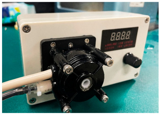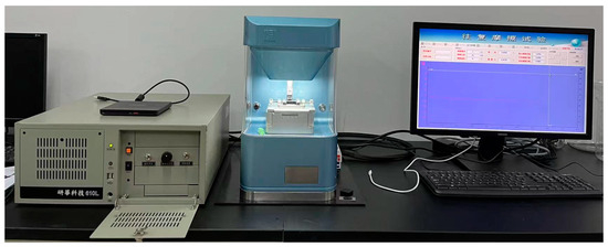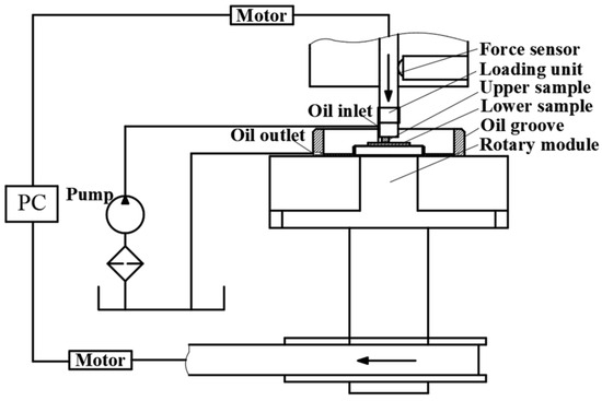 The experiment used the MS-M9000 multifunctional friction tester (connected to a computer) to simulate the sliding friction conditions of the valve plate pair system, testing the friction and wear characteristics of the valve plate pair materials under different operating conditions. As shown in Figure 1 and Figure 2 the upper specimen (simulating the cylinder body) was mounted on a friction pair loading rod driven by a servo motor, with a friction force sensor on one side to detect the friction force between the friction pair. The lower specimen was mounted on the rotating module of the test machine, driven by a servo motor for rotational motion at a speed range of 0–2000 r/min. The lubricant used was No. 15 aviation hydraulic oil, with a density of ρ = 8.73 × 10−8 kg/mm3, and dynamic viscosities of v1 = 20.19 mm2/s at 40 degrees Celsius and v2 = 5.03 mm2/s at 100 degrees Celsius. The lubricant was supplied through a lubricating oil pump via pipelines, as shown in Figure 3, with adjustable flow rates, and the return oil flowed back to the oil bottle through a tube. During the experiment, the COF was indirectly calculated using a computer based on real-time data measured with the friction force sensor, with experiment force, speed control, and data collection all controlled via the computer at a sampling frequency of 9 Hz.