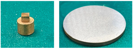 The surface roughness of the lower specimen followed the processing technique for piston pump valve plate, with a surface roughness of 0.4 μm. The surface hardness of the lower specimen was of uniform Rockwell hardness, which measures hardness at five points per specimen and calculates the average as its representative value. The surface hardness of the upper specimen was measured at 203 HV using a Vickers hardness tester. The material parameters of the specimens are detailed in Table 1, and actual photos of the upper and lower specimens are shown in Figure 4.