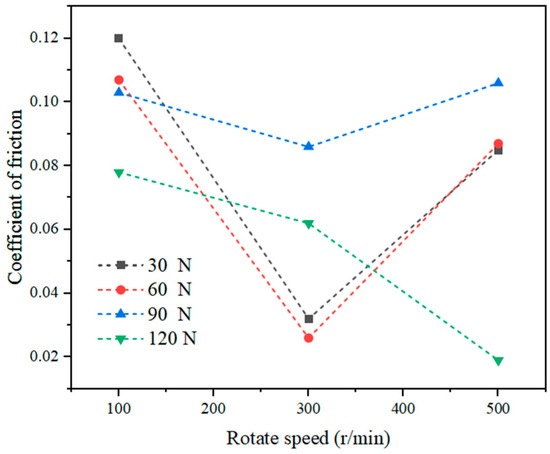 Figure 6 shows the friction curve under conditions of constant speed and variable load conditions (when the speed is constant, with comparison of different loads). As the load increased from 30 N to 120 N and the linear velocity changed from 100 r/min to 500 r/min, the COF fluctuated within the range of 0.010 to 0.120. At a speed of 100 r/min, the COF decreased with an increase in load, with a 35% decrease as the load increased from 30 N to 120 N. Under conditions of 300 r/min and 500 r/min, with an increasing load, the COF showed a trend of first slowly decreasing, then increasing, and finally decreasing again. The results indicate that at 300 r/min and loads less than 120 N, the COF was minimal.