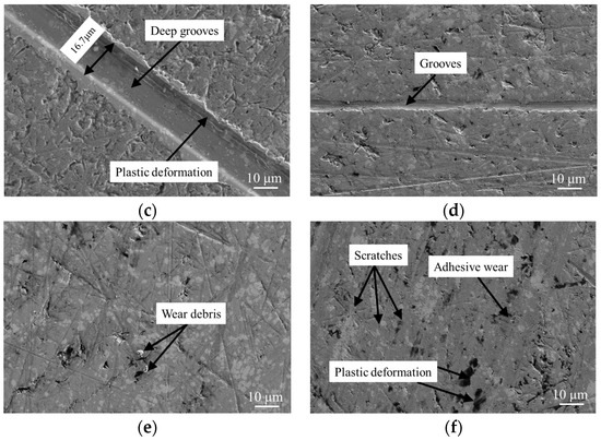 Figure 8 gives the surface morphology of the W9 steel disc friction pair under different loads and speeds. As shown in Figure 8a–f, clear wear marks were observed under all experimental conditions. At 100 r/min, fine scratches and grooves were visible, indicating mild abrasive wear (Figure 8a,d). However, at a speed of 500 r/min, due to the presence of deep grooves, mild abrasive wear transitioned to severe abrasive wear (Figure 8c), with scratches produced by abrasives exceeding 16 μm. The presence of grooves parallel to the sliding direction is a sign of abrasive wear [43,44,45]. At 300 r/min, micro-cutting dominated, with some areas showing signs of micro-fatigue and shallow pits formed through delamination (Figure 8b) [46], indicating abrasive wear in the form of grooves under these conditions, accompanied by adhesive wear. Although the ploughed sections caused by micro-grooving and micro-cutting appeared similar, the difference was in the fact that micro-cutting formed less compressed debris than micro-grooving, making the debris from micro-cutting easier to peel off [47]. Micro-cutting created deeper furrows on the worn surface. As shown in Figure 8e (load of 60 N, speed of 300 r/min), small pits and worn debris were found on the worn surface, with minor adhesive wear present. Compared with Figure 8e, under conditions of 60 N and 500 r/min, as shown in Figure 8f, the sample surface appears to have undergone severe adhesive wear, along with significant plastic deformation and scratches.