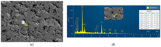 As can be observed from the previous analysis results, under different load conditions, the COF was the smallest at a speed of 300 r/min. The morphology of the specimen’s frictional material wear patterns under conditions of 300 r/min and various loads was analyzed as shown in Figure 9. The EDS spectrum data for points A, B, and C in Figure 9 are presented in subfigures (d), (e), and (f), respectively.