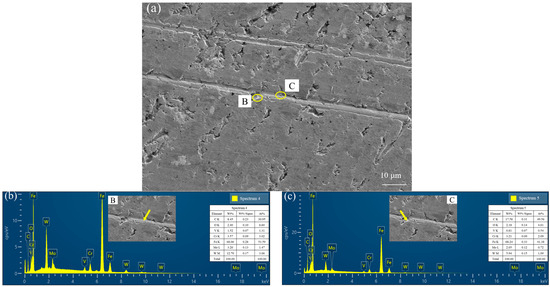 With an increase in speed, the friction pair’s surface temperature increased rapidly, and the instantaneous heat generated by friction could not dissipate promptly. After the speed reached 300 r/min, material transfer occurred in parts of the friction pair, leading to adhesive wear. To confirm this, the morphology of the W9 steel disc surface under conditions of 120 N and 500 r/min was analyzed, as shown in Figure 10, where subfigures (b) and (c) represent the EDS data spectra for points B and C in Figure 10a, respectively. As seen in Figure 10b, deep scratches and plastic deformation areas were visible on the W9 disc, with surface material detachment forming pits and featuring the primary elements of the sampled material along with a minor amount of oxygen. This further confirmed the occurrence of adhesive wear and a small amount of oxidative wear during the wear process.