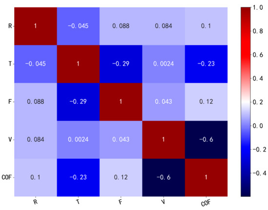 Usually, dataset features can be extracted based on experience, but in large datasets, redundant data remain inevitable. The correlation between tribological features directly impacts the accuracy of the method applied. Therefore, a Pearson correlation analysis was conducted between pairs of features, with the correlation heatmap shown in Figure 11. All four features listed in Table 4 were selected as they showed no strong correlations amongst one another, indicating that the features chosen for ML training were not redundant.