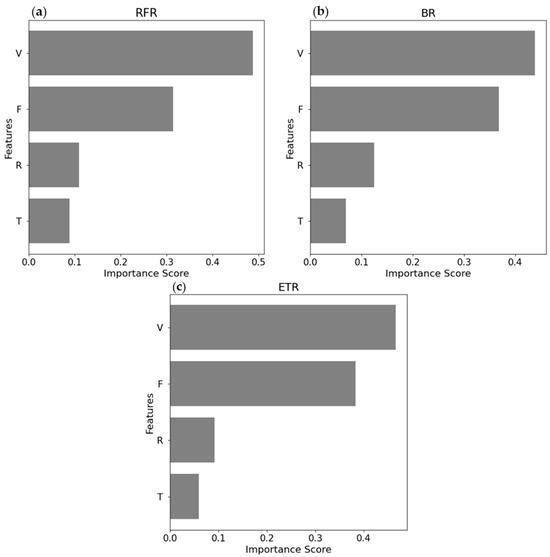 Ranking of feature importance determined using ML: (a) RFR algorithm, (b) BR algorithm, and (c) ETR algorithm.