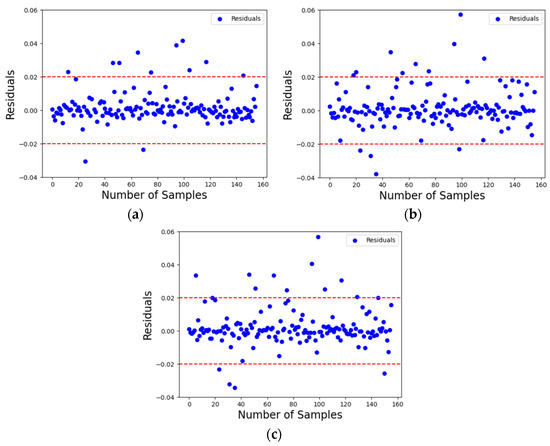 Due to the utilization of multiple explanatory variables in the model, the linear regression (or more accurately, a hyperplane) cannot be visualized in a 2D graph. However, residuals (the differences or vertical distances between actual and predicted values) and their corresponding sample numbers were evaluated through plotting residuals in the regression model. To verify the predictive accuracy of the COF prediction models, as shown in Figure 15, the residual predictions of the test dataset based on three ML methods were plotted. The red dashed lines in the figure respectively represent the residual values equal to 0.02 and −0.02. This aided in detecting non-linearity and outliers while checking whether these errors were randomly distributed. It was observed that for residual values between predicted and actual values, the ETR model’s residuals fluctuated slightly near 0, with fewer outliers deviating from the center. Therefore, a good random distribution error was obtained for the ETR model, indicating that the trained ETR model performed well on the test set without overfitting the training data. It studied the relationship between the inputs and outputs effectively, making the ETR model the best choice for predicting variations in the COF.