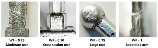 The first method for obtaining the Hot Tearing Index value in this study was described by Wu []. The HTI1 value is determined on the basis of the number of tears (NT), the type and size of the tear (“weighting factor”—WF) and the number of evaluated arms (NA) by the following Equation (1).