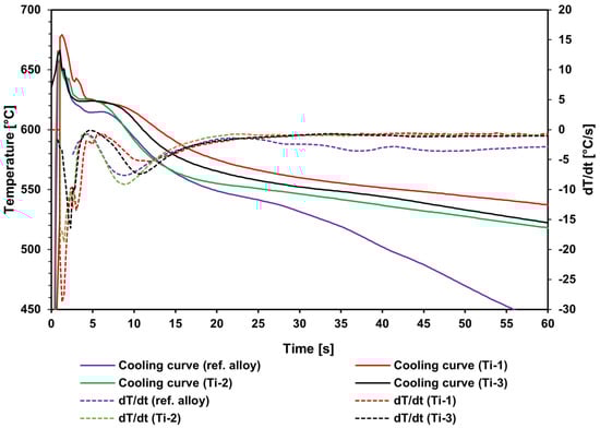 Based on the above, it can be seen from the thermal analysis record that the solidification of the Ti-refined AlSi5Cu2Mg alloy starts with the crystallization of the Ti-based phases []. The crystallization of the Ti phases takes place before the solidification of the primary phase α-(Al) in the temperature range of 638 to 645 °C (it is also the liquidus temperature).