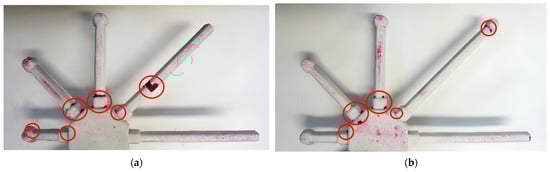 A visual inspection of the test arms was carried out prior to the quantitative evaluation to characterize the severity of the tears produced. The visual inspection was subsequently verified by capillary control (Figure 4). The detected tears were marked with red circles in Figure 4.