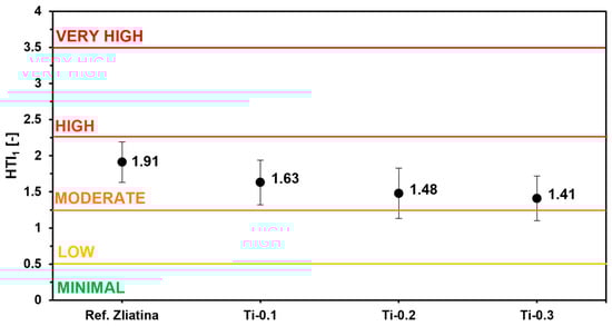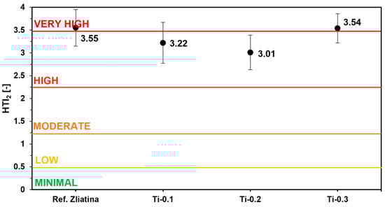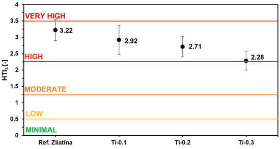 The value of the HTI3 index was obtained by combining the relationships used to calculate HTI1 and HTI2 (Figure 7). The alloy without Ti addition reached the value of HTI3 = 3.15 and was classified among the alloys with high susceptibility to tearing. Subsequently, a decrease in the value of the HTI3 index was observed with an increasing wt.% of Ti. With the addition of 0.1 wt.% of Ti, the HTI3 index decreased from 3.15 to 2.92 (a decrease of 7.30%). The Ti-2 alloy showed a 13.97% decrease in HTI3 compared to the reference alloy. In this case, the best results were obtained with the Ti-3 alloy. The value of the HTI3 index decreased by almost 28% from 3.15 to 2.28 with the addition of 0.3 wt.% Ti. The alloys with Ti additions were classified as having a high susceptibility to tearing, as was the reference alloy.