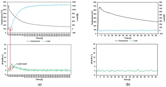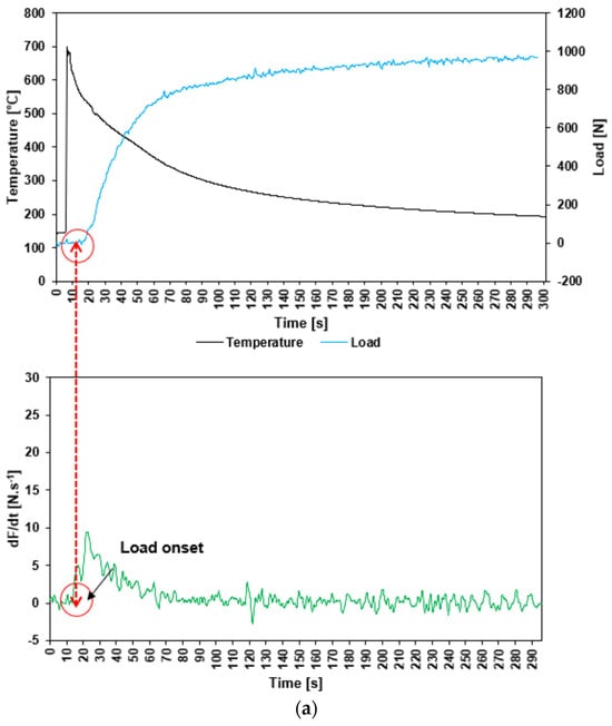 In Figure 10a, the recorded load curve of the Ti-3 alloy from Test no. 2 is shown, which is characterized by a smooth course of the force curve without tear detection. The maximum value achieved for the force acting on the bolt in the test arm was 974 N. The green curve, obtained by the first derivative of the solidification curve with respect to the time, indicates the beginning of the development of the rate of load increase. Figure 10b shows the Ti-3 alloy from test no. 2.