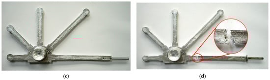 Figure 8b shows the load history of the reference alloy from Test #2. In this case, compared to the alloy from Test #1, there was no increase in strength due to the stresses generated during the solidification of the casting. Based on the force curve, it could be assumed that the test arm was immediately torn off along the entire cross-section during solidification. The alloy from Test #2 with the arm immediately torn off is shown in Figure 8d.