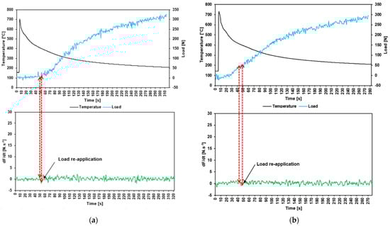 Curve of the load force, temperature, and load force ratio: (a) ref. alloy (Test #1), and (b) ref. alloy (Test #2); the sample from the respective measurement: (c) ref. alloy (Test #1), and (d) ref. alloy (Test #2).