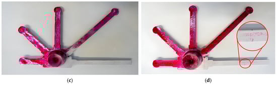 The relevant value of the WF coefficient was determined by visual inspection of the tears on 4 test arms. Capillary control was performed to confirm the nature of the tears. The capillary control was performed according to EN ISO 3452-1 []. A test system marked IICe according to EN ISO 3452-1 was used for the capillary control. A Diffu-Therm capillary system consisting of a BRE cleaner, BDR red penetrant and BEA white developer (Diffu-Therm, Herten, Germany) was used for the color capillary control. The penetration time was 60 min. It was evaluated in two steps. The first evaluation was performed immediately after the developer dried and the second after the development time of 15 min. The test was performed at a temperature of 22 °C.