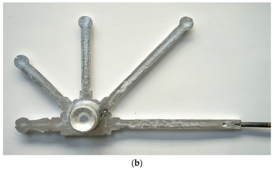 The design of the mold (Figure 1a), which was part of the overall measuring device (Figure 1b), was designed to support the formation of tears in the casting during solidification. The gating system transported the melt into the cavity of the mold, which was formed by five arms of different lengths. The ends of 4 of the 5 arms were made with spherical ends so that these ends would support the occurrence of inhibited shrinkage and cause a higher susceptibility to tear formation. These 4 arms were used for quantitative evaluation of the tearing susceptibility. The quantitative analysis was performed visually and then verified by capillary control for tear detection. The fifth test arm was used for qualitative evaluation. The fifth (longest) arm was provided with an anchor screw at the end so that its part was overcast with melt. The other end of the screw was attached to the S9M load cell (HBM, Darmstadt, Germany), whose purpose was to record the tensile forces acting in the casting during solidification. A thermocouple was placed in the mold cavity and connected to the NATIONAL INSTRUMENTS Hi-Speed USB Carrier NI USB 9162 measurement card (National Instrument, Austin, TX, USA), which processed the data. The purpose of the thermocouple was to record the temperature as the alloys solidified. From this, the temperature and time of tear initiation could be determined in the event of a tear occurrence in the casting.