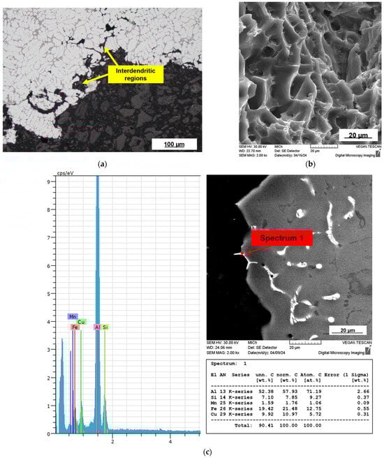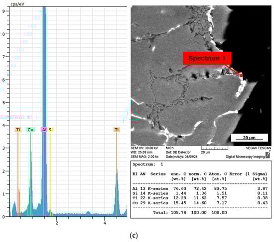 By observing the microstructure of the fracture profile of the reference alloy without Ti addition, it was found that the fracture occurred due to ductile failure along the dendrite boundaries of the α-(Al) phase (Figure 11a,b). One of the initiation sites for tear formation was contractions that occurred in the interdendritic regions of the material (Figure 11a). In addition to ductile failure during tear initiation, areas of cleavage failure were observed on the tear profile (Figure 11c) due to the presence of intermetallic phases based on Cu and Fe.