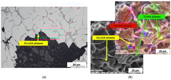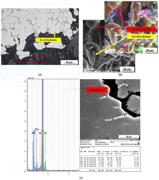 Microstructural evaluation of the Ti-1 alloy profile showed that the tear initiation mechanism was characterized by ductile failure along the dendrite boundaries of the α-(Al) phase. Locally, a fracture was observed at the boundary between the dendrites of the α-(Al) phase and the Cu-based intermetallic phases (Figure 12a). The fracture surface of the Ti-1 alloy is characterized by brittle fracture due to the presence of cleavage facets. By means of qualitative surface analysis, the cleavage facets were identified as intermetallic phases rich in Cu and Fe (Figure 12b). Figure 12c shows the EDX analysis of the Cu- and Fe-based intermetallic phases, which served as a suitable site for transcrystalline tear propagation.