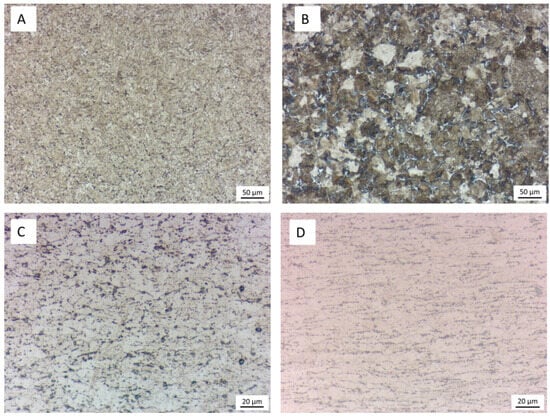 Table 3 presents the chemical composition, hardness, and roughness, Ra and Rz. The percentage of alloy elements in both the pin (SAE 1050) and the plate (SAE 1010) met the specifications for their respective materials. After surface heat treatment, the pins displayed a homogenous, tempered martensitic structure on the surface, while the core exhibited a primarily pearlitic microstructure (Figure 1A,B). As a result, the material’s surface hardness was measured to be approximately 550 HV (52 HRC). The sheets’ microstructure (Figure 1C,D) consisted mostly of a ferritic matrix with pearlite islands at the grain boundary. The micrograph of the longitudinal sample position (Figure 1D) showed elongated grains, likely due to the manufacturer’s cold rolling process. Therefore, the surface hardness of the material was about 128 HV (71 HRB).