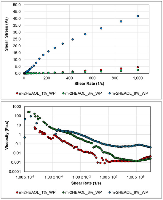 Moving onto the rheological behaviour of particle-free formulations, Figure 2 shows that the formulations exhibit non-Newtonian behaviour, specifically pseudo-plasticity [34], which is characterized by decreasing viscosity with increasing applied tension [35]. This viscosity behaviour is caused by the solvation of polar solute molecules and solvents, which increases viscosity at rest, but decreases it with increasing applied tension as the shear action destroys the solvated layers. Recent research suggests that lubricants with Newtonian behaviour may not meet the demands of newer technological applications, such as those in wire drawing [36]. Arif et al. [37] demonstrated that pseudo-plastic lubricants can reduce the friction coefficient in high-pressure systems like bearings.