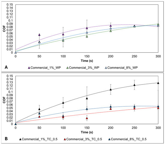 For the Commercial_1%_TC_0.5 formulation, the COF value rose close to 0.12. This suggests that the addition of talc particles reduced the lubricity compared to the Commercial_1%_WP formulation, which does not contain talc particles. It is possible that the known lubricant adsorption/absorption capacity of talc [38,39] reduced the concentration of commercial additive available in the aqueous solution, leading to a decrease in the lubricity of this formulation.