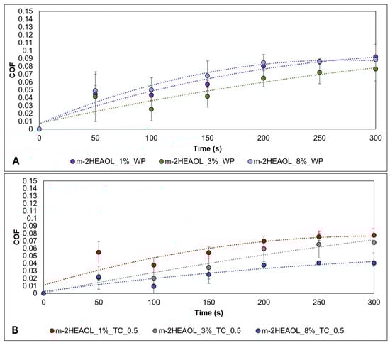 After 300 s of testing, it was discovered that formulations containing m-2HEAOL without added particles (Figure 4A) exhibited comparable COF values to those containing commercial additives (COF value close to 0.08). This suggests that using m-2HEAOL as a lubricant additive could be a viable alternative to current market products.