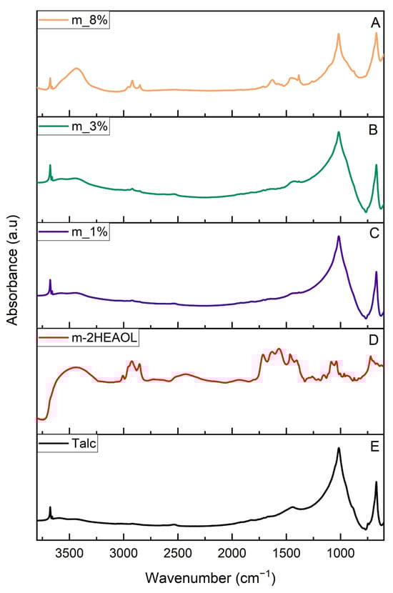 FTIR spectra of: m-2HEAOL (A), m_8% talc; (B) m_3% talc; (C) m_1% talc; (D) m-2HEAOL; (E) untreated talc.