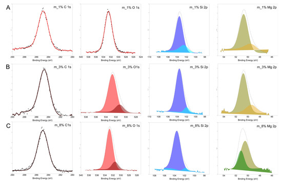 XPS analysis. (A): m_1% talc sample; (B): m_3% talc sample; (C): m_8% talc sample.