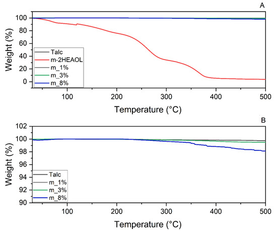 The results of the study showed that the behaviour of the samples of m_1% particles was similar to untreated talc particles (Figure 7B), indicating that the amount of PIL adsorbed/absorbed by the particles in the m-2HEAOL_1%_TC_0.5 formulation was negligible. The total mass loss for m_3% particles was about 0.5% at 500 °C, while for m_8% particles, it was approximately 2%, indicating a greater amount of PIL adsorbed on the particles. The degradation of m-2HEAOL began at around 300 °C, which coincided with the onset of the acceleration of m-2HEAOL degradation, confirming that this degradation is linked to the PIL molecules adsorbed/absorbed in the talc samples.