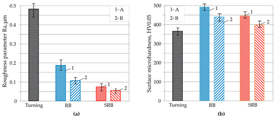 - The technological possibilities of the SRB method for achieving the desired SI characteristics according to the functional purpose of the burnished component have been experimentally shown, achieving a mirror-finish surface (Ra = 0.055 μm) but a fatigue strength lower than that of the conventional RB-A process. The SRB-B process achieves low height and functional roughness parameters (Ra = 0.073 μm) and the greatest fatigue strength compared to other burnishing processes.