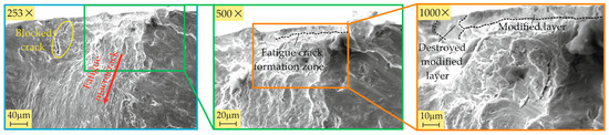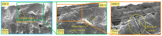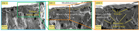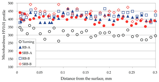 - All four burnishing processes create a modified surface layer with thicknesses of about 10 μm from the RB-A, SRB-A, and RB-B processes, and over 20 μm from the SRB-B process. This layer has the greatest crack resistance when created using SRB-B. The main fatigue macro-crack is formed at the interface between the modified layer and the remaining material for all specimens except the one treated using SRB-A. The reason for this is that SRB-A creates a surface with a large negative skewness (leading to micro-stress concentrators), which, in combination with smaller compressive residual stresses, is a prerequisite for the formation of a fatigue macro-crack from the surface.