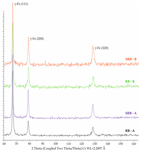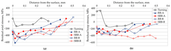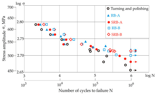 - The RB-B process is more efficient than the RB-A process when the stress amplitude is over 540 MPa. Assuming that the bending yield limit is equal to the yield limit determined using the tensile test (see Table 4), the RB-B process is more effective in both low-cycle fatigue (where plastic deformations occurs) and at the beginning of the high-cycle fatigue field, where the strains are elastic. When the stress amplitude is below 540 MPa, the RB-A process leads to a greater fatigue life. Therefore, at smaller bending stress amplitudes, greater surface cold work, resulting in maximum surface microhardness (Figure 5b) and maximum surface residual compressive stresses (Figure 8), maximizes the effect of RB on -cycle fatigue strength.