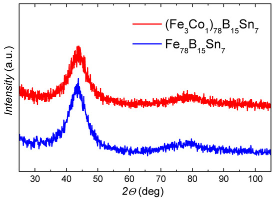 - Butvinová, B.; Švec Sr., P.; Janotová, I.; Fos, A.; Maťko, I.; Janičkovič, D. Magnetic and structural properties of (Fe-Co)83(Sn-P)5B12 alloys with high saturation. J. Magn. Magn. Mater. 2021, 535, 168069. [Google Scholar] [CrossRef]