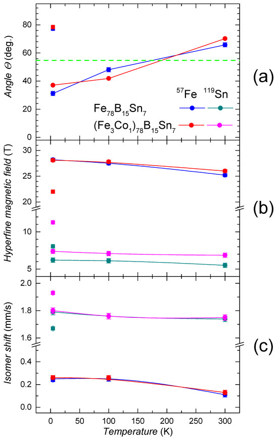- Miglierini, M.B.; Dekan, J.; Cesnek, M.; Janotová, I.; Švec, P.; Bujdoš, M.; Kohout, J. Hyperfine interactions in Fe/Co-B-Sn amorphous alloys by Mössbauer spectrometry. J. Magn. Magn. Mater. 2020, 500, 166417. [Google Scholar] [CrossRef]