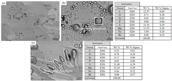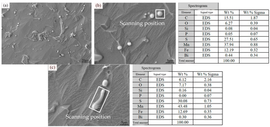 Morphology of inclusions captured by SEM + EDS after electrolysis of 3# (Bi-0.013%): (a) overall morphology of inclusions; (b) spherical MnS inclusions analyzed by point scanning; (c) rod-like MnS inclusions analyzed by point scanning.