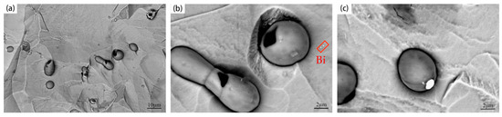 Morphology inclusions captured by SEM after electrolysis of 5# (Bi-0.026%): (a) overall morphology of inclusions; (b) Bi element in steel matrix; (c) Bi element in inclusions.
