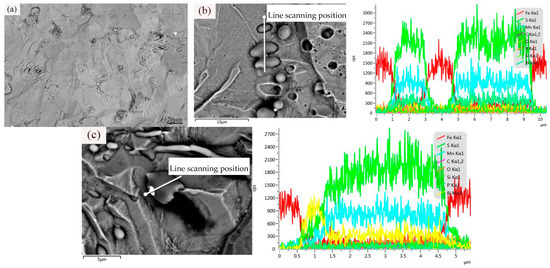 The morphology of inclusions captured by SEM + EDS after electrolysis of 6# is shown in Figure 5. It can be seen that the shape of the inclusions is mainly spherical and rod-shaped, and most of these inclusions are distributed unevenly at the grain boundaries in a chain shape or a divergent shape. The size of most of the rod-shaped inclusions is between 3.5 and 5.5 μm, the largest rod-shaped inclusion is 16.04 μm, and the aspect ratio reaches 5.4. Through line scanning analysis of the inclusions, it can be seen that the components of the inclusions are MnS, and the white material on the side of MnS inclusions is Bi, as shown in Figure 5b,c.