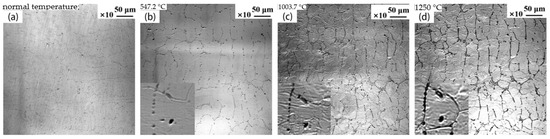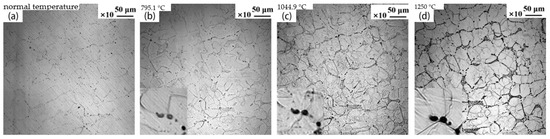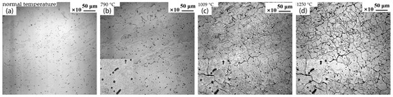 Morphological evolution of microstructure and inclusions of 6# (Bi-0.031%) during heating: (a) normal temperature; (b) 795.1 °C; (c) 1044.9 °C; (d) 1250 °C.