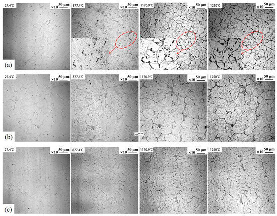 In order to investigate the effect of bismuth content on the microstructure and inclusions of bismuth-containing free-cutting steel, experimental steels 1# (without bismuth), 2# (Bi-0.010%), and 6# (Bi-0.031%) with different bismuth contents were selected for in situ observation at high temperatures, and their evolution process was analyzed.