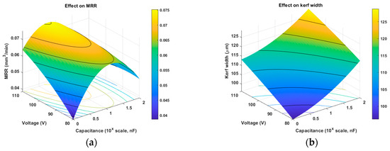 Observing Figure 4a and Figure 5a, MRR increased with gap voltage. Its increase contributes to the energy of sparks which increases the amount of material removed. The same as gap voltage, capacitance value is proportional to the value of discharge energy. However, with the change in each level of capacitance, MRR changed more sharply compared to levels of gap voltage. The graph shows that an increase in capacitance from level 1 to level 2 increased the material removed through an increase of spark energy; the analogous trend was observed by Hu et al. [43]. Followingly, by increasing capacitance from level 2 to level 3, MRR decreased. Increasing spark energy contributes to a bigger volume of removed material; however, for capacitance level 3, the amount of discharge energy was very high which may result in excessive amounts of debris concentration. Due to the presence of debris, a portion of energy was wasted on machining the debris which slowed down the removal rate of workpiece material [44]. This effect is commonly known as secondary sparks [45].