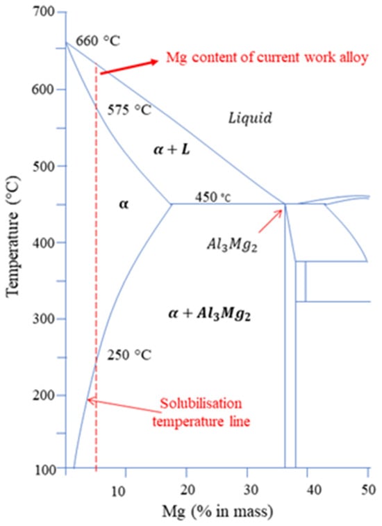 From the standard phase equilibrium diagram in Figure 1, an alloy with 5 wt% Mg is expected to have a second phase (Al3Mg2) at room temperature, since the Mg solubility is low at low temperatures. A faster cooling rate of the material would change the phase equilibrium, and a higher amount of solid solution of Mg may occur (as an α-phase matrix, in the case of non-Al3Mg2 precipitation).