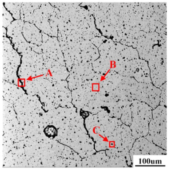 Scanning electron micrograph of CMT-WAAM obtained with the AWS ER5356 filler wire. A and C are particles of β-phase (Al3Mg2); B is the grey colour background that corresponds to the α-phase (Reprinted with permission from ref. [4]. 2024 Elsevier (License Number 5797940990297).