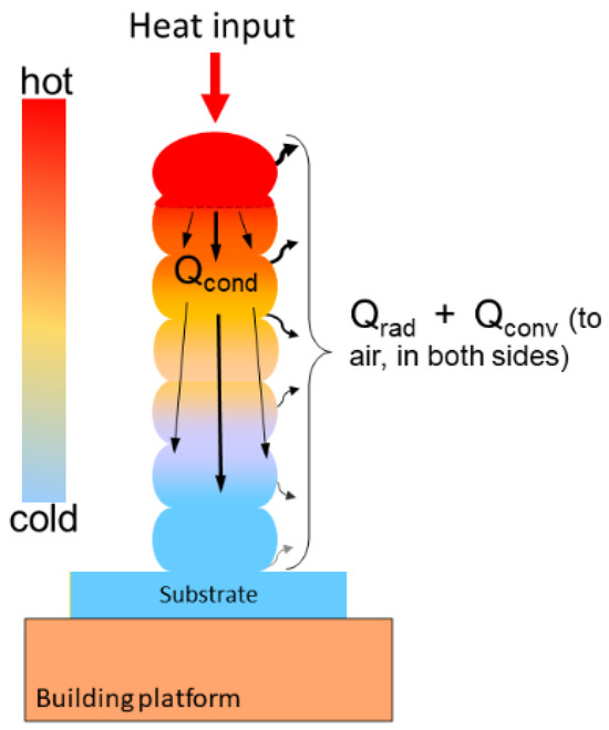 One of the most popular WAAM technologies for building up thin walls uses CMT® (Cold Metal Transfer) as a heat source. CMT® is a patented (Artelsmair [7]) version of the GMAW (Gas Metal Arc Welding) process that controls short-circuiting metal transfer through current and wire feeding (the droplet detaches from the pool to end the short-circuit by a wire retraction-controlled movement). For more information on CMT®, see, for instance, Selvi et al. [8]. In this regard, CMT-WAAM has two fundamental features that affect the solid-state phase transformation of an AlMg5 alloy. The first fundamental feature is heat accumulation, which delays the cooling rate of the wall, in particular within the low-temperature range. This is due to the predominance of conduction as the heat transfer mechanism, as illustrated in Figure 3. The heat from the pool dissipates mainly downwards, not favouring concurrent natural radiation and convection to the environment. However, considering the conductive area to be small (thin walls), the heat diffusivity is low. In WAAM, this phenomenon of heat distribution is commonly referred to as heat accumulation. Moreover, heat accumulation at lower temperatures might promote precipitation and precipitation coarsening.